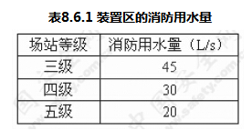 8.6.1 石油天然气生产装置区的消防用水量应根据油气、站场设计规模、火灾危险类别及固定消防设施的设置情况等综合考虑确定,但不应小于表8.6.1的规定。火灾延续供水时间按3h计算。